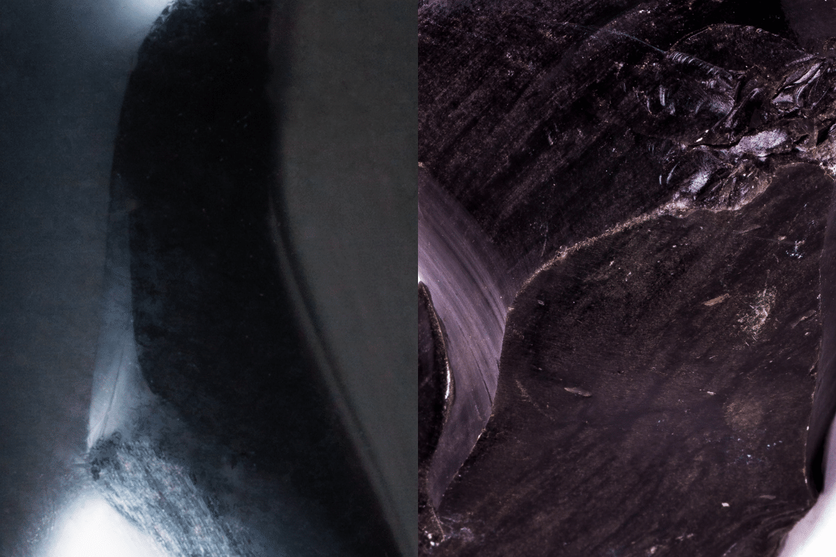 Secondly, onyx has slightly dull clarity because it is a crystal. Onyx exhibits milk-like whitish or grayish whirls and spots within the gemstone. For obsidian, the whitish or grayish inclusions do not appear like a fluid.